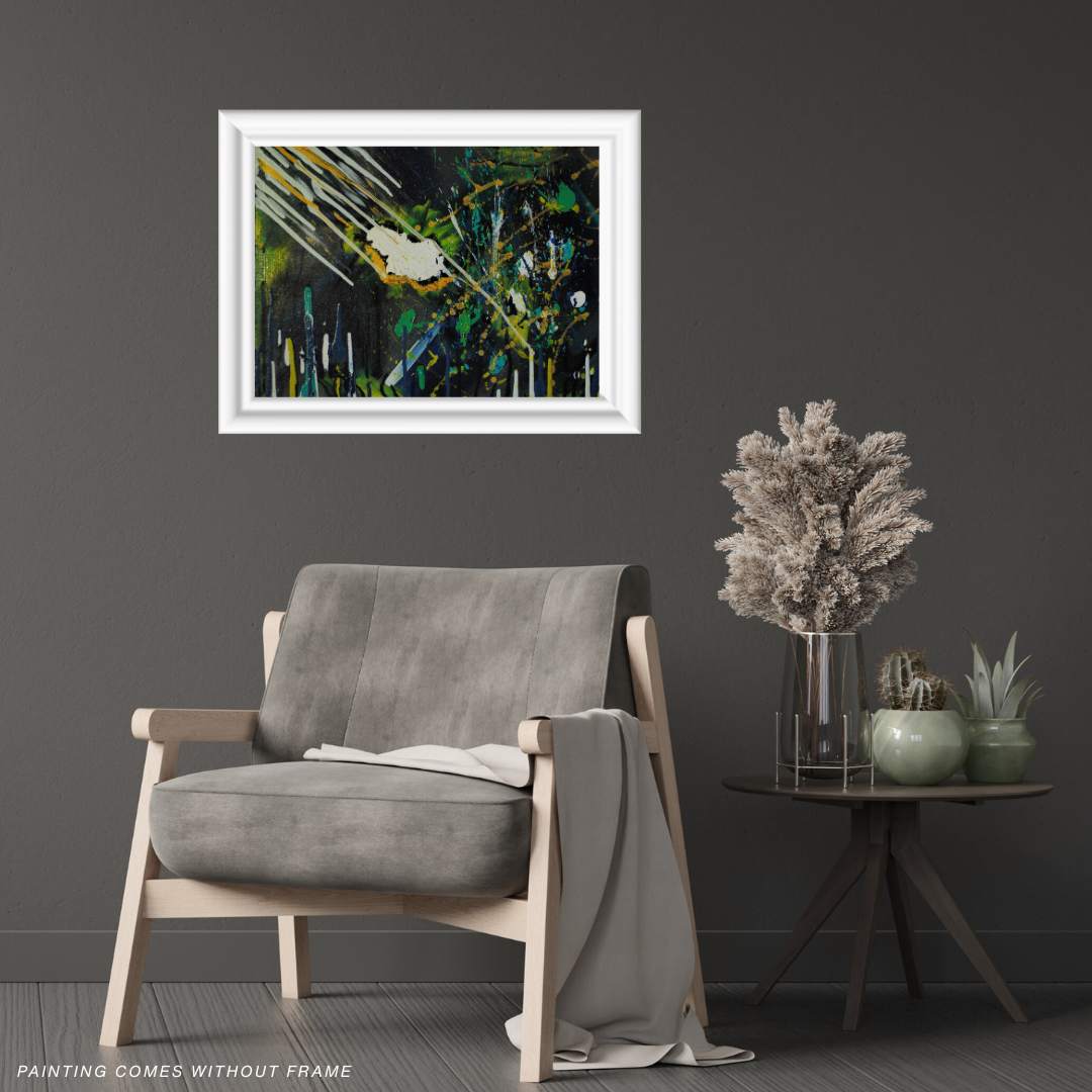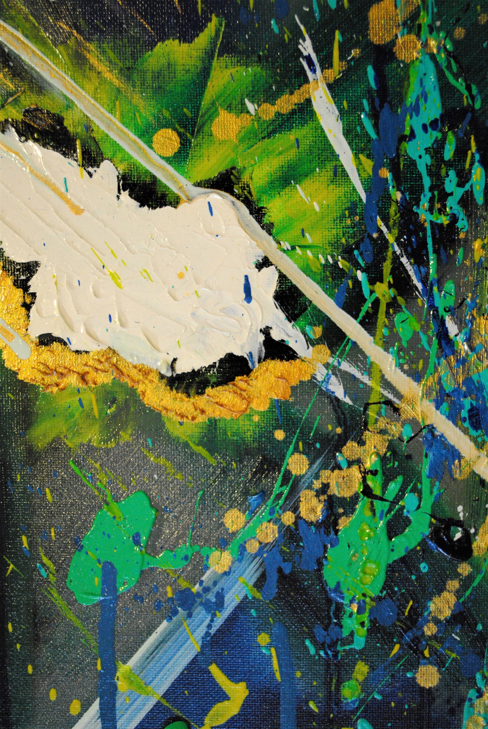 "Battle of Mind and Matter" presents an exploding exploration of color and form. Dominated by deep hues of blue and green, complemented by vibrant teals, luminous whites, warm yellows, and gold shimmer. This piece invites the viewer to engage with the emotional and conceptual tension inherent in the title. This striking composition encapsulates the ongoing conflict between the intangible realms of thought and the tangible aspects of the physical world. Oil on canvas. Original, 2013